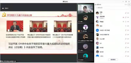 近日,我校体育学院全体教职工、学生党员及入党积极分子通过线上会议的方式,参加了学习贯彻党的十九届六中全会精神专题宣讲会。会议由我校学习贯彻党的十九届六中全会精神宣讲团讲师罗美琪老师宣讲,体育学院党总支副书记张楠老师主持。