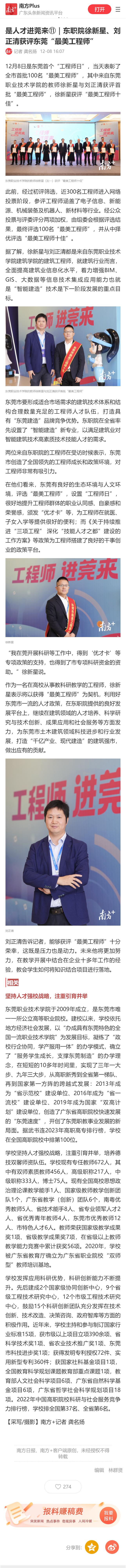 【南方+】是人才进莞来⑪|东职院徐新星、刘正清获评东莞“最美工程师”